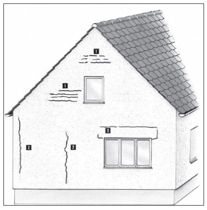 Verformungen dieser Art sind in obiger Abbildung schematisch dargestellt, z.B. Durchbiegung von Decken und Unterzügen (1), Längenänderungen von Betonbauteilen (Ringanker, Decken usw.), Fundamentsetzungen, Schwind-, Kriech- und Temperaturverformungen tragender Wände und Stützen (2) und (3), unterschiedliche Lastabtragung (4), Einwirkungen aus dem Dachstuhl oder Schwächung des Mauerwerks (5) usw.